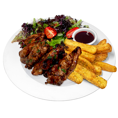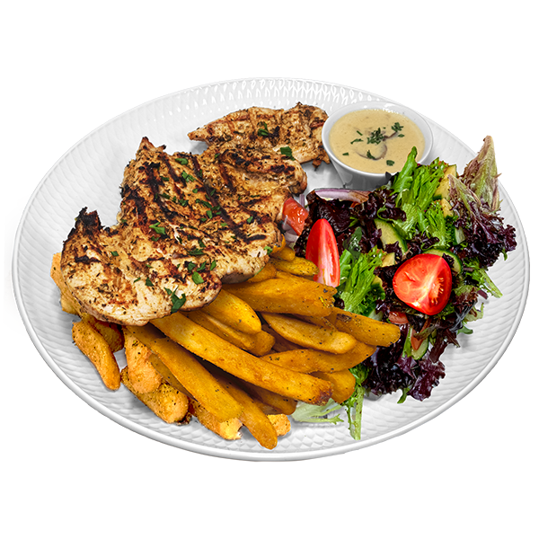 MARINATED GRILLED CHICKEN STRIPS served on bed of mixed lettuce, tomato, cucumber, onion with balsamic dressing & aioli.0