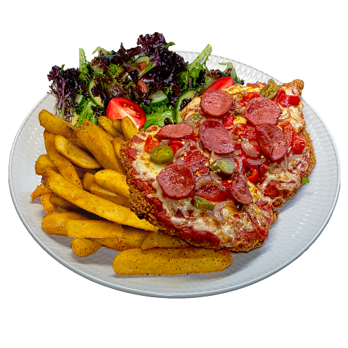 Chicken, salami, capsicum, red onions, semi dried tomato, olives cooked in napoli, cream & finished w parmesan & parsley.0