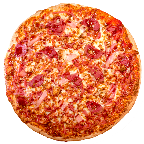 BBQ sauce, cheese, ham, chicken, hot salami, and bacon
