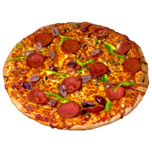 Tomato, Cheese, Ham, Hot Salami, Bacon, Spanish Onions, Olives, Garlic & Chilli