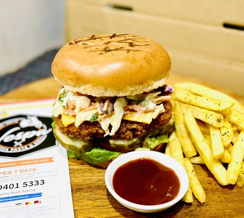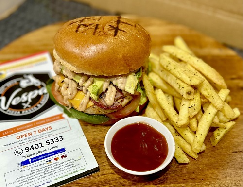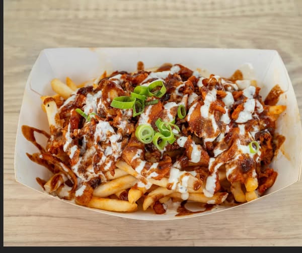 Vespa snack pack w fat chips, cheese, choice of chicken or lamb or tandoori chicken w BBQ, chili sauce & garlic aioli.