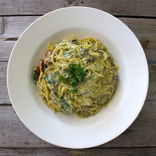 Chicken, mushrooms, pesto, semidried tomatoes, spinach, cream & parmesanPasta Opt